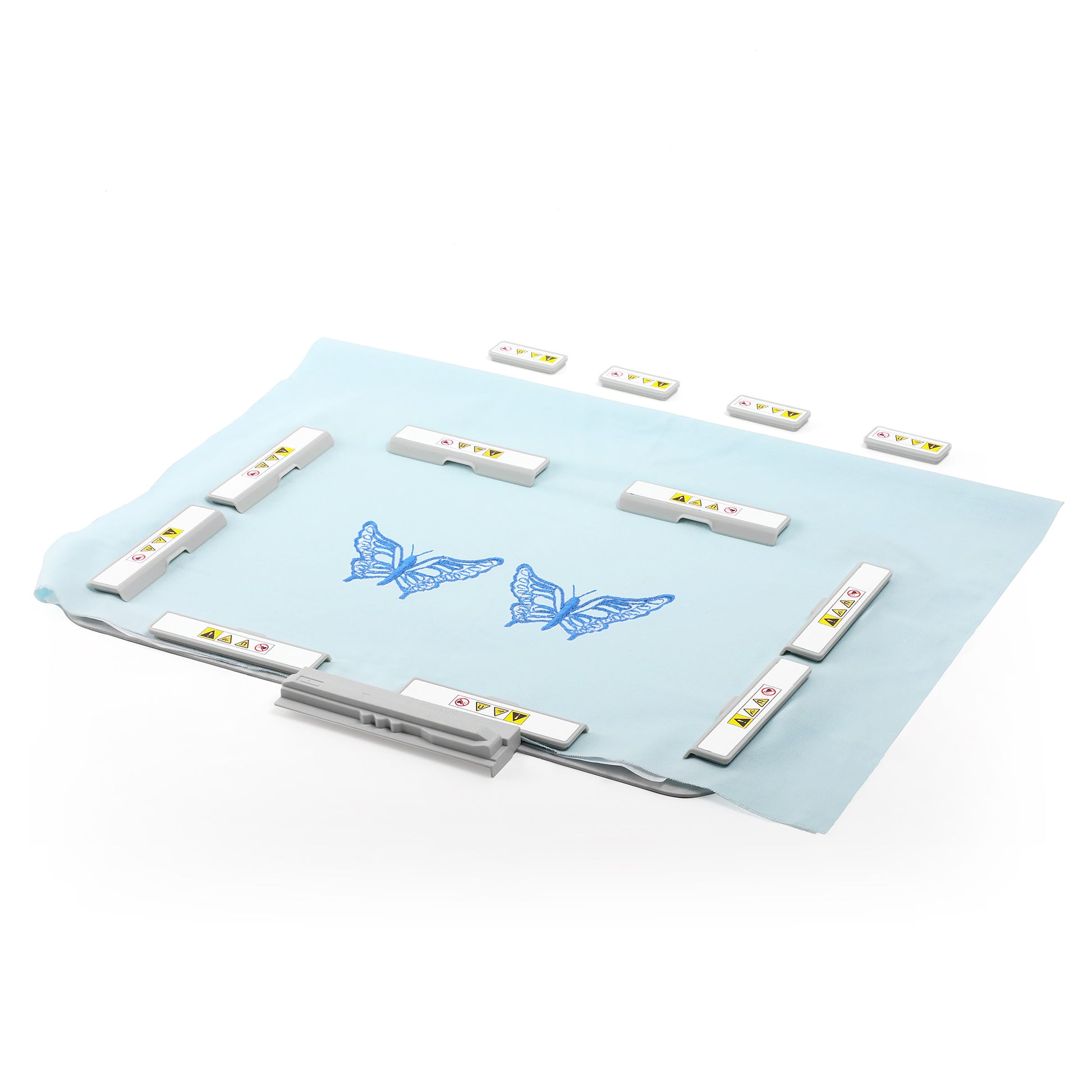 Firmly secures fabric for embroidery while allowing quick adjustments—simply lift and reposition individual magnets without removing the whole hoop. -