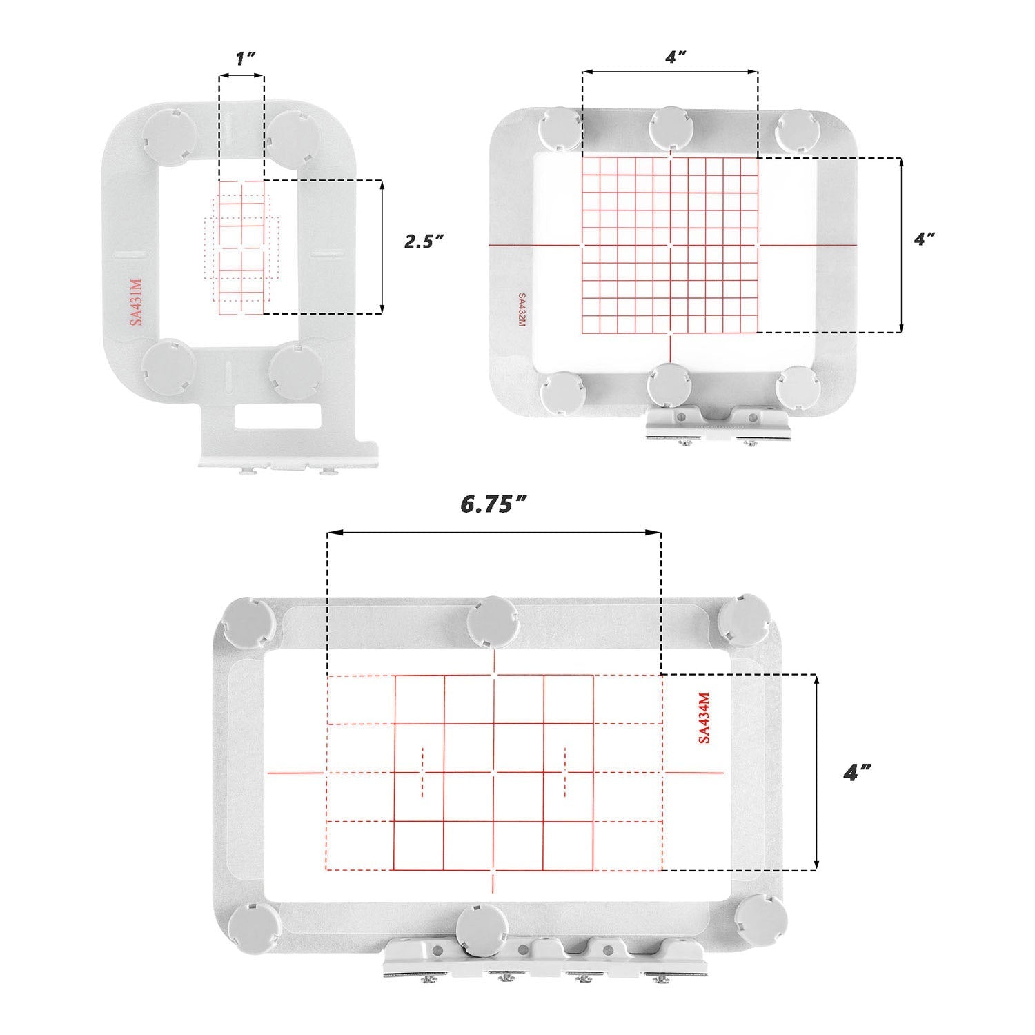 3in1-A: 3 x Magnetic Embroidery Hoop Set: SA431M (EF61M)+SA432M (EF62M)+SA434M (EF71M); 16 x Magnets; 3 x Grid Template.